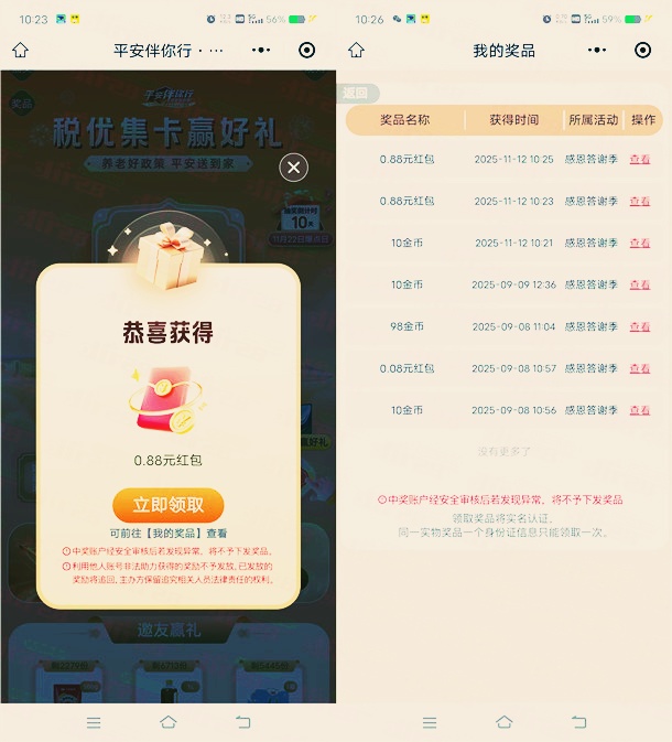 平安金管家举办的税优集卡赢好礼活动,打开微信进去小程序活动里,完成简单的浏览任务可以抽奖多次,合成还可以抽1次、点去评选还能抽1次,有机会中到0.88-18.8元现金红包、实物,小编亲测刚中2次0.88元,24小时后可以提现。