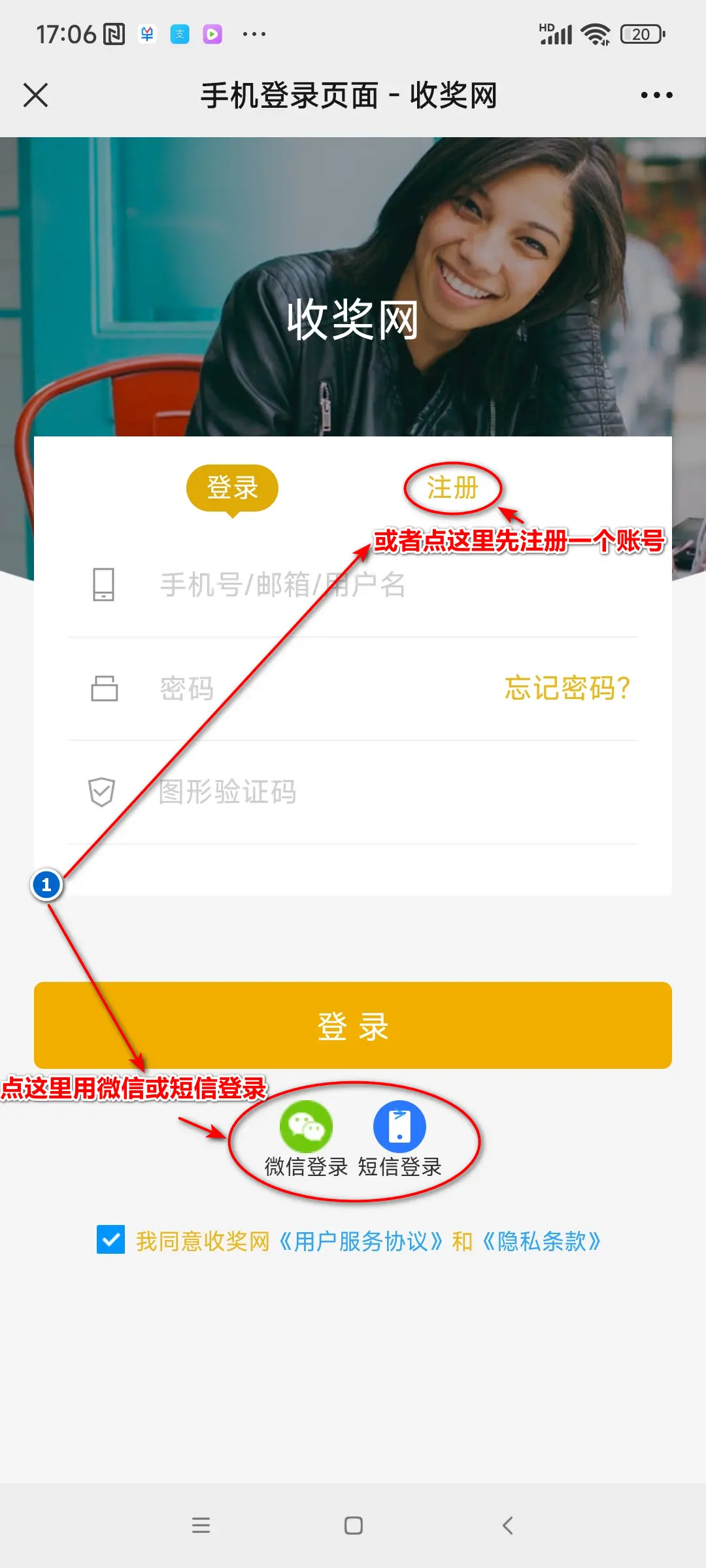 2、微信/短信登录并补充资料,或者先注册一个账号