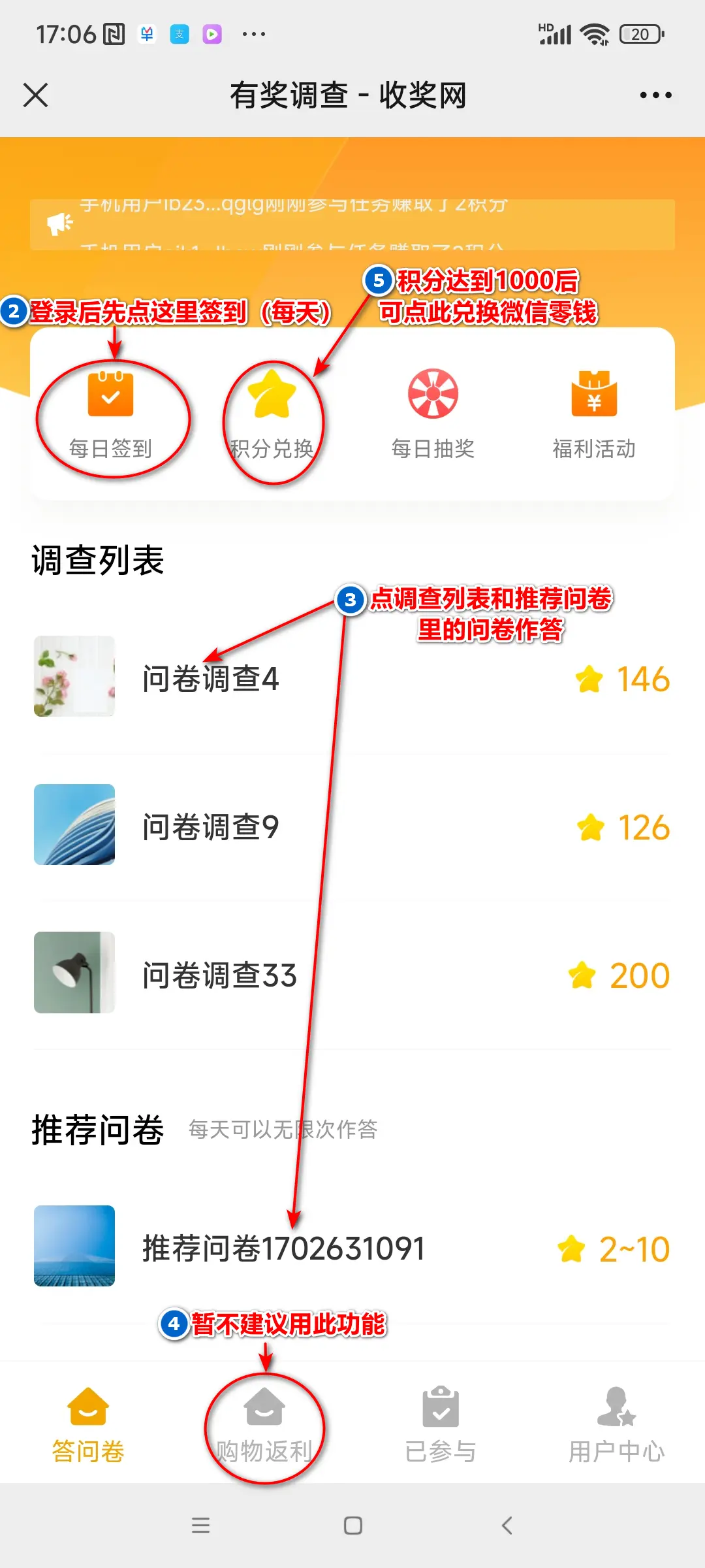 3、登录后每日签到并回答问卷,积分达1000可兑换微信零钱